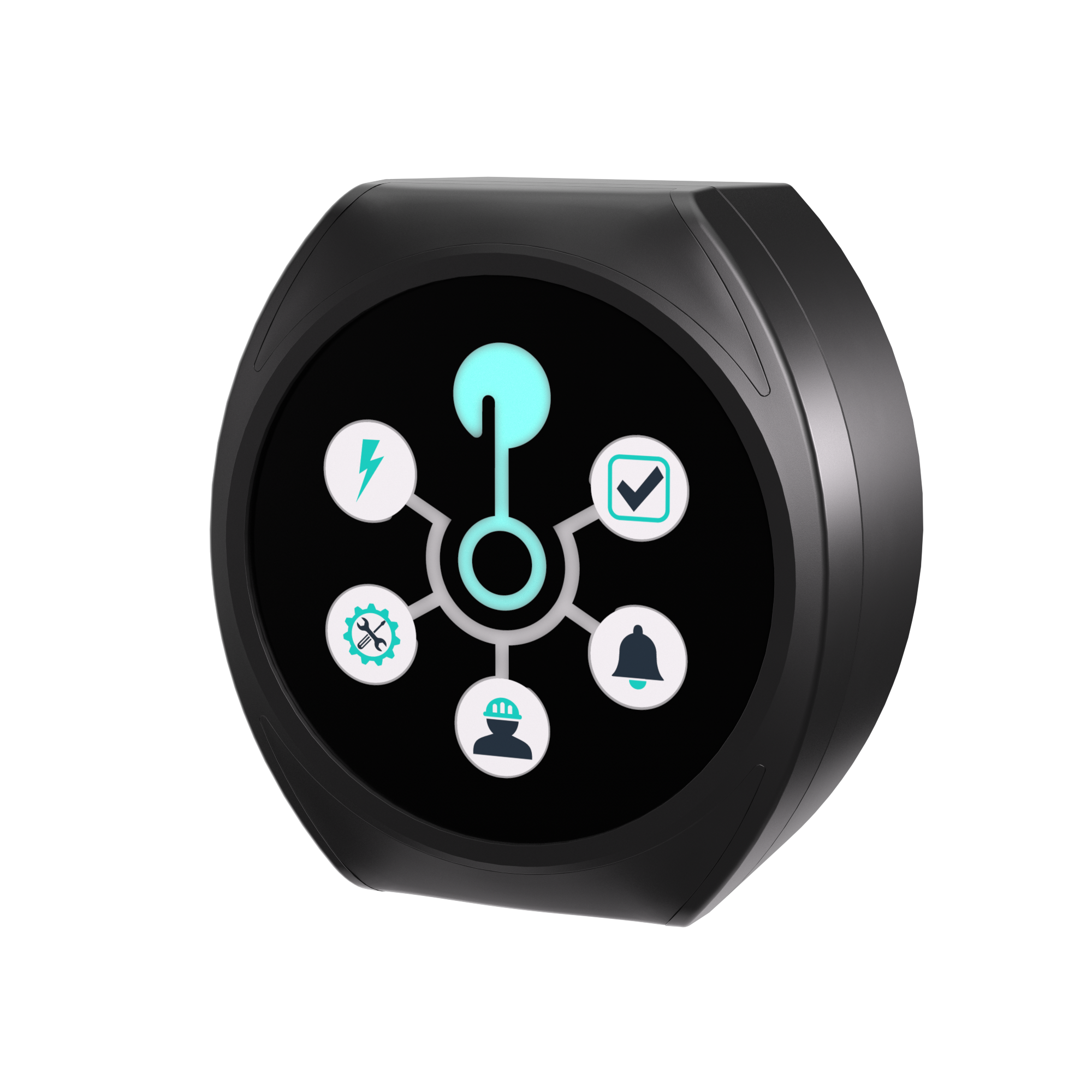 Beispiel 1: Der Werker erkennt eine Maschinenstörung und drückt eine Taste. Ein Alarm wird ausgelöst und die zuständige Person informiert. Die Status-LED am HUB-Signal zeigt an: die Störung ist gemeldet und in Bearbeitung.