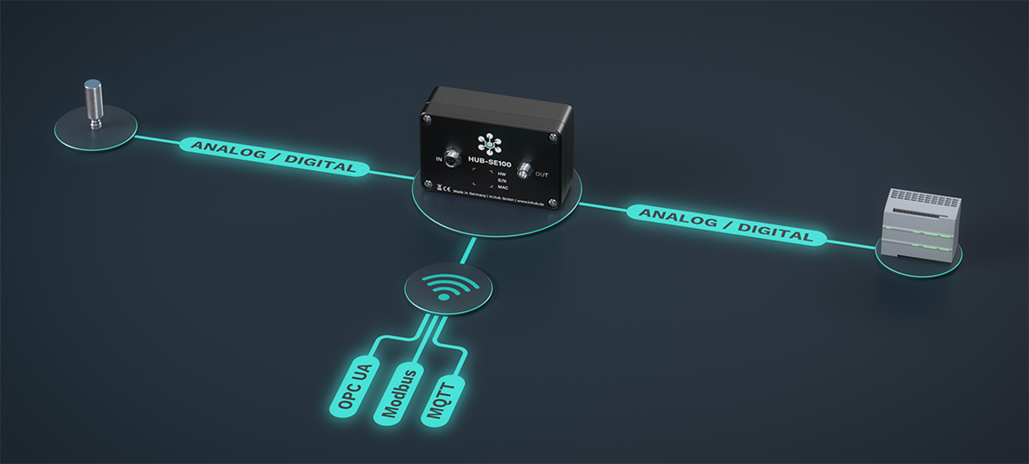 Das HUB-SE100 erweitert bestehende Module intelligent und schafft zusätzliche Datenpunkte, indem es direkt am Sensor angeschlossen wird. Damit kannst du z.B. analoge Signale digitalisieren oder Signale vor der Steuerung abgreifen, weil für den Sensor keine freie Schnittstelle mehr verfügbar ist oder du nicht an die Steuerung kommst. Klein und leicht zu installieren, lässt es sich perfekt für Retrofitaufgaben oder Testläufe verwenden, wenn in die bestehende Infrastruktur nicht eingegriffen werden soll.